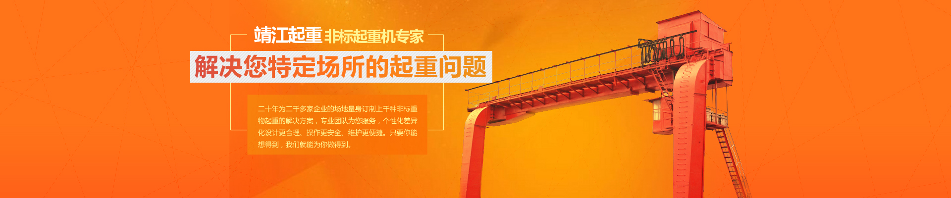 20余年專(zhuān)注起重機(jī)研發(fā)、制造、安裝和售后服務(wù),為你量身定制,解決特定場(chǎng)所物料搬運(yùn)問(wèn)題。